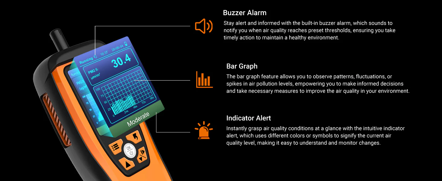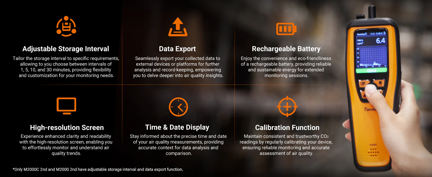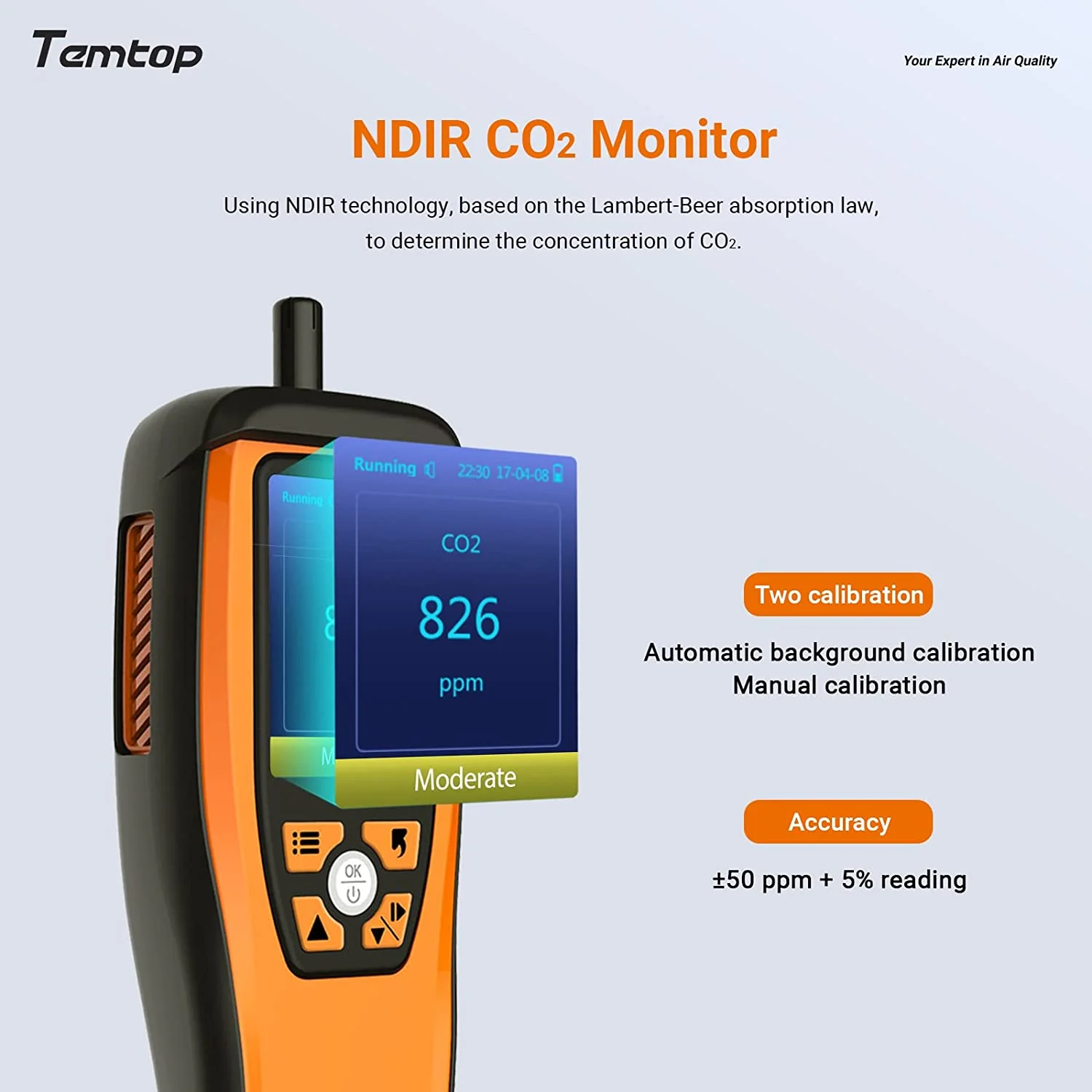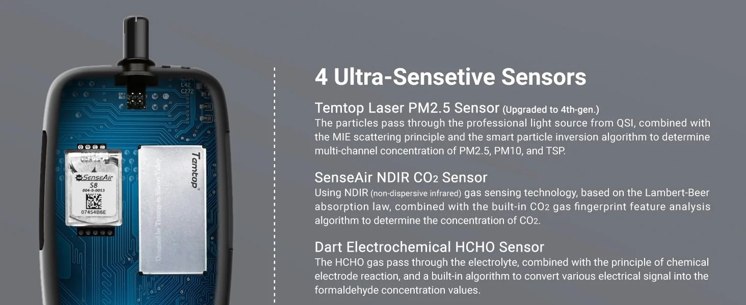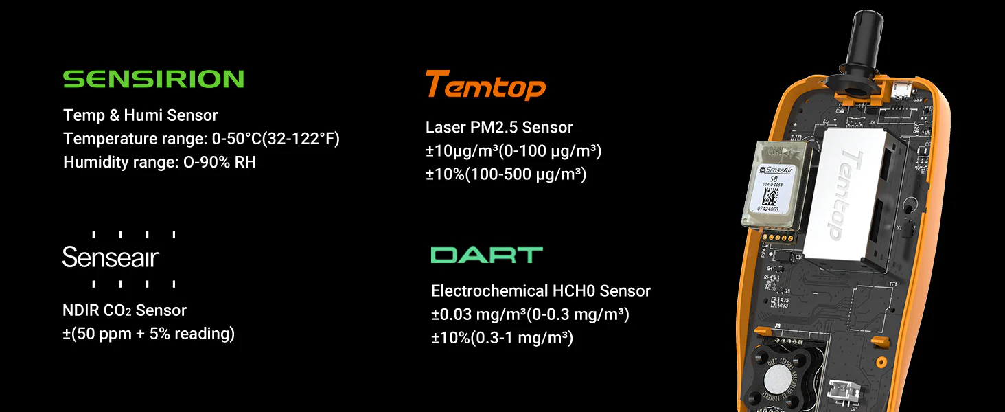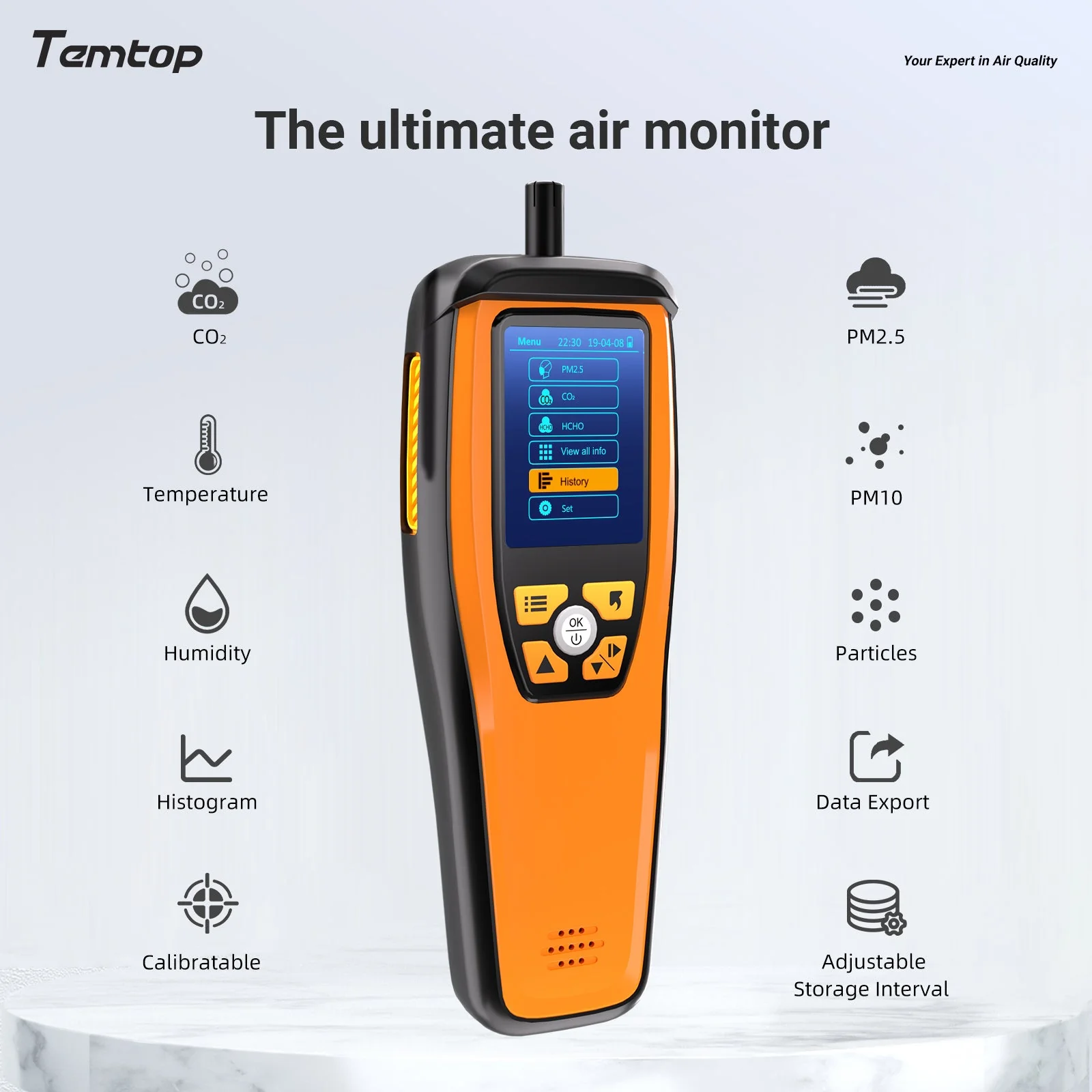 Temtop M2000C детектор за квалитет на воздух ни овозможува да ги мери-ме CO2, PM2.5, PM10, НСНО, температура и влажност. Податоците може да се формираат во хистограм и да се прикажат во реално време.